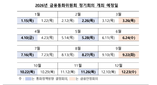 한은, 2026년 금통위 일정 공개…1월 15일 첫 기준금리 결정