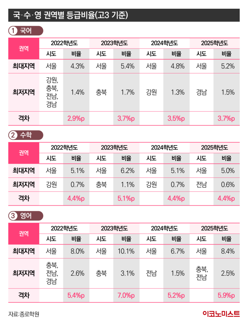 수학은 1등급 학생 비율의 지역 간 차이가 2022학년도 4.4%p, 2023학년도 5.1%p, 2024·2025학년도 각각 4.4%p였다. 2등급 이내에서는 10.2~11.0%p 격차가 나타났다.