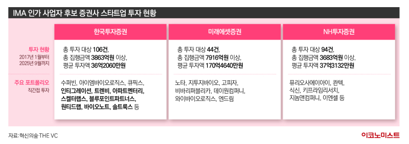 IMA 인가 후보인 한국투자증권·미래에셋증권·NH투자증권의 스타트업 투자 현황을 살펴보면 IMA 인가 후 모험자본 투자 행보를 예상해 볼 수 있다. 각 증권사의 투자 성향과 성과에 따라 차이가 생기기 때문이다.