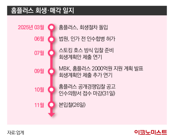 홈플러스 인수 후보자가 등장했다는 것은 긍정적인 일이다. 이는 지난 3월 회생 개시 이후 약 7개월 만, 서울회생법원의 회생 인가 전 M&A 승인(6월) 이후로는 약 5개월 만이다. 다만 인수 후보자 등장에도 홈플러스 회생에 대한 기대감이 높지 않다. 인수 후보자인 두 기업 모두 유통산업과는 거리가 멀고 자금력도 입증되지 않아서다.
