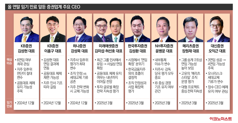 금융투자업계에 따르면 자기자본 상위 10대 증권사 중 7곳의 CEO가 올해 말부터 내년 초 사이 임기를 마친다. 오는 12월에는 KB증권 김성현·이홍구 대표, 하나증권 강성묵 대표의 임기가 종료되고, 내년 3월에는 미래에셋증권 김미섭·허선호 대표, 한국투자증권 김성환 대표, NH투자증권 윤병운 대표, 메리츠증권 장원재 대표, 대신증권 오익근 대표가 차례로 임기 만료를 맞는다.