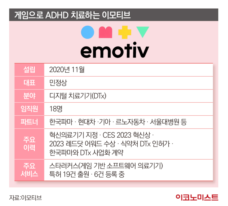 현대자동차에서 운전자 인지모델을 연구해 온 연구원이 불모지에 도전장을 던졌다. 인지 모델링을 자동차가 아닌 게임에 적용해 ADHD(주의력 결핍 과잉행동장애) 어린이를 위한 치료제를 개발하고 있다. 주인공인 민정상 이모티브 대표는 디지털 치료기기(Digital Therapeutics·DTx) 분야에서 부작용 없는 혁신 치료제의 대중화를 꿈꾸고 있다.
