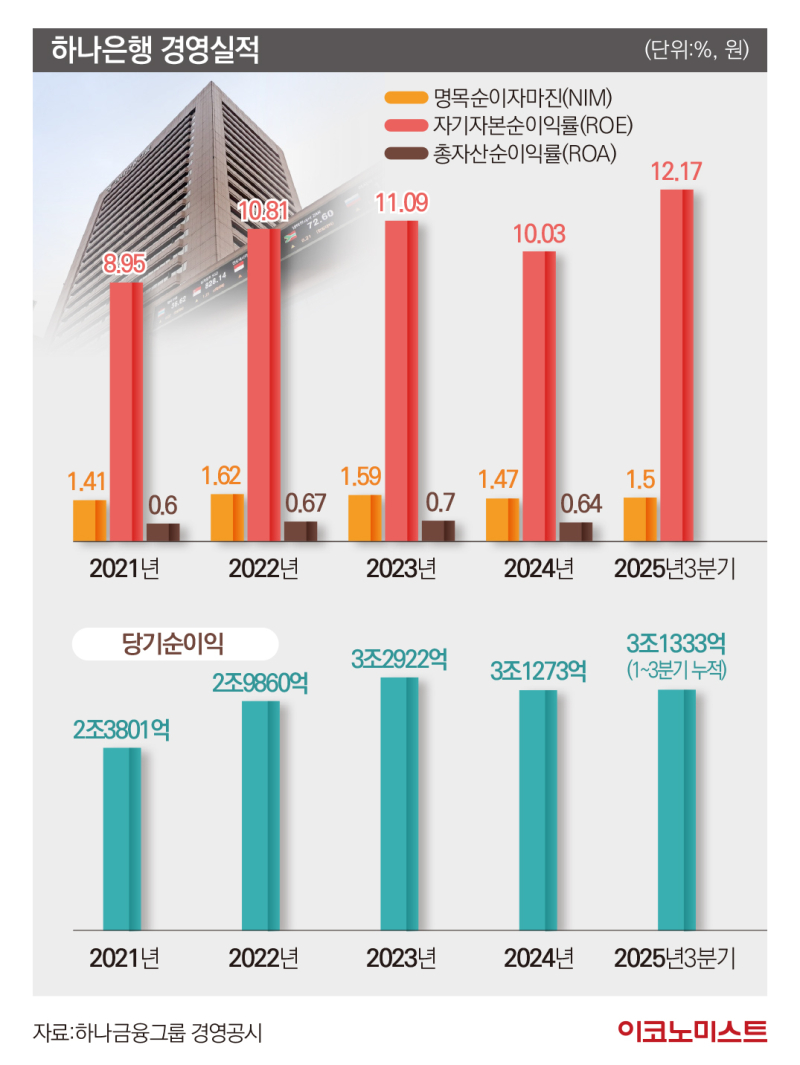[이코노미스트 이병희 기자] 이호성 하나은행장이 취임하며 내건 ‘손님 중심’ 경영철학과 ‘영업’에 특화된 강력한 리더십은 하나은행을 KB국민은행, 신한은행과 어깨를 나란히 하는 초접전 ‘3강 체제’로 끌어올리는 데 성공했다는 평가를 받는다. 올해 1~3분기 역대급 순이익(3조1333억원)을 달성하며 리딩뱅크 지위 탈환의 교두보를 마련했다. 하지만 성장 이면에는 자산 건전성 악화 위험과 외부 규제 압박이라는 걸림돌을 해결해야 한다는 지적도 나온다.