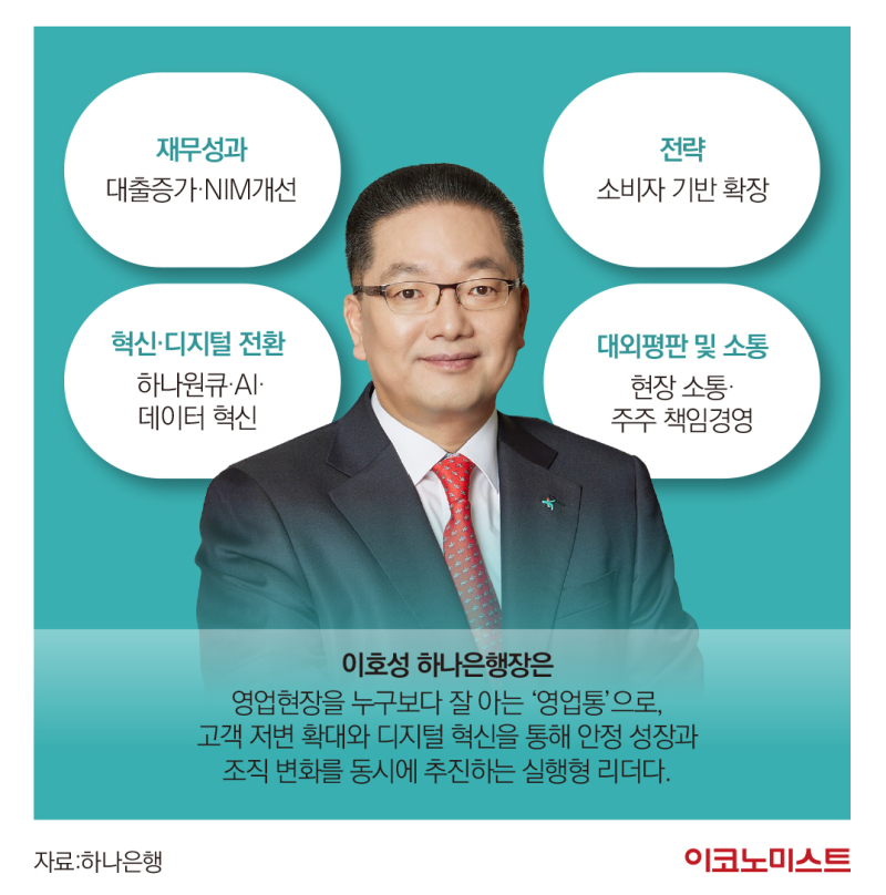 금융업계 관계자는 “이호성 하나은행장의 리딩뱅크 탈환을 위해서는 ‘수익성과 건전성을 동시에 잡는 고도의 균형 감각’이 필요하다”며 “공격적인 영업 드라이브를 정교한 리스크 관리 시스템으로 통제하고 다양한 고객층을 확보해야 한다”고 말했다.