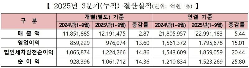 3분기 실적만 보면 2분기 대비 매출액(3.9%), 영업이익(34.3%), 순이익(60.9%) 모두 직전 분기 대비 증가했다. 업종별로는 누적 기준 전기·전자, 제약 등 13개 업종에서 매출액이 증가한 반면 건설, 유통 등 7개 업종은 감소했다.
