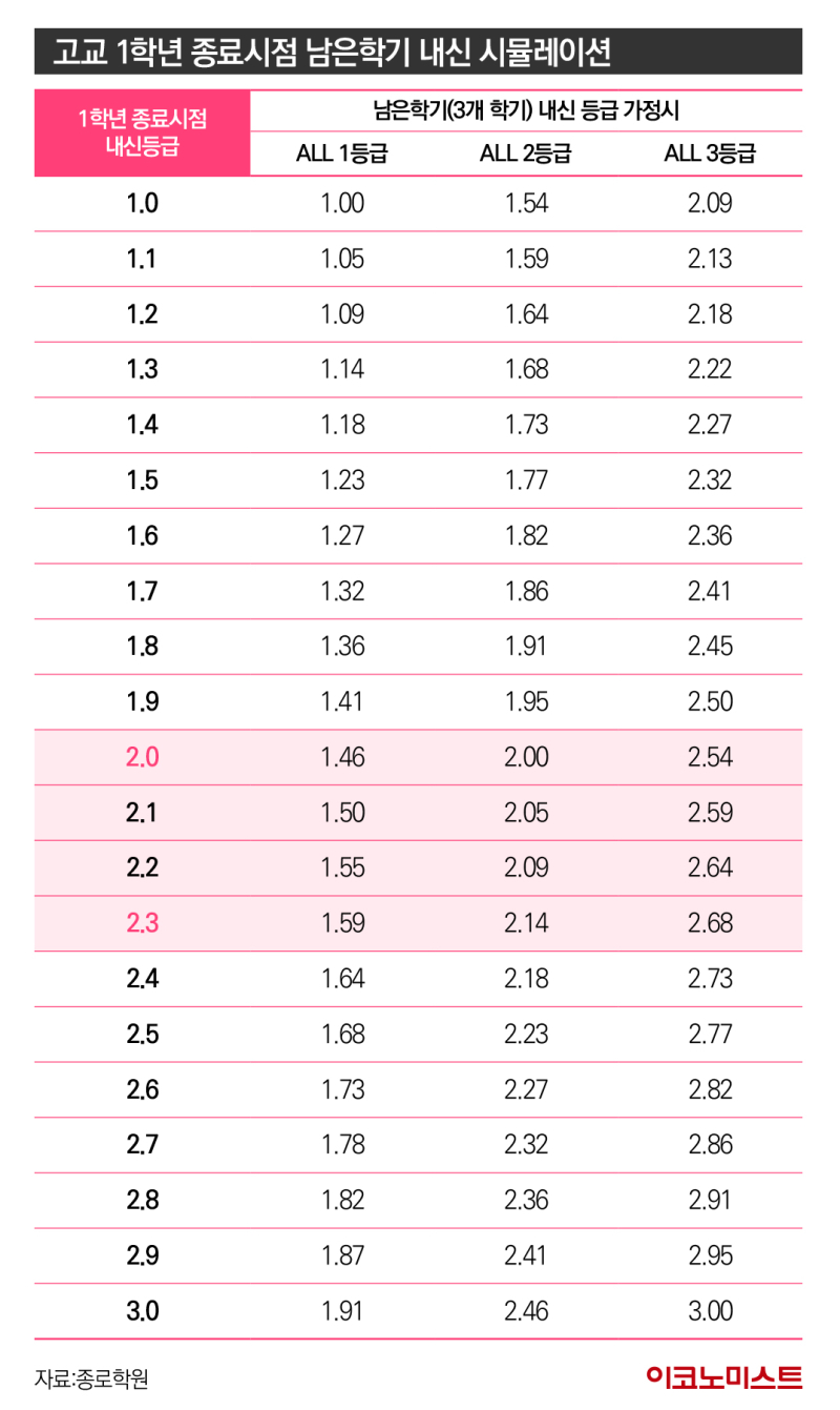 내신 등급별 향후 전략 가늠도 중요한 변수다. 5등급제 기준 1학년 종료 시점 평균이 2.0등급인 학생이 남은 학기에서 모든 과목 1등급을 받으면 최종 약 1.46등급이다. 반면 1학년 평균이 2.3등급일 경우, 이후 모든 과목 1등급을 받더라도 최종 약 1.59등급 수준으로 추산된다.
