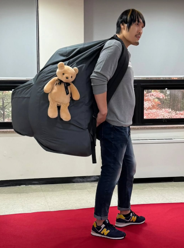 사진 속 최홍만은 평범한 티셔츠와 청바지 차림에 운동화를 신고 있지만, 시선을 사로잡는 것은 그의 등에 멘 거대한 백팩이다.
