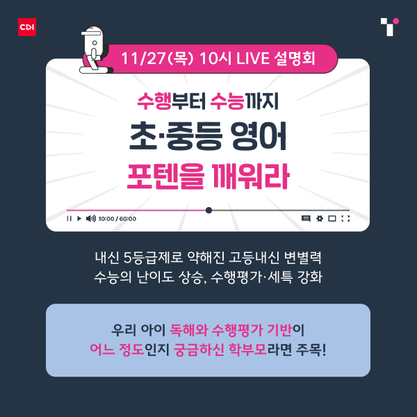 국내 영어교육을 선도하는 크레버스 청담어학원이 오는 11월 27일(목) 오전 10시, 크레버스 공식 유튜브 채널에서 ‘초·중등 영어 포텐 깨우기’ 무료 라이브 설명회를 진행한다. 26년 수능 영어의 변별력 강화와 평가 방식 변화, 내신 5등급제·수행평가 확대, 말하기·쓰기 평가 강화 등 영어 평가체제가 빠르게 변화하면서 초·중등 학부모들의 관심이 높아지고 있는 흐름에 맞춘 것이다. 설명회에는 수능 영어 1위 강사 주혜연, 대치 청담어학원 조문성 원장이 출연해 실제 사례 기반의 인사이트를 전할 예정이다.