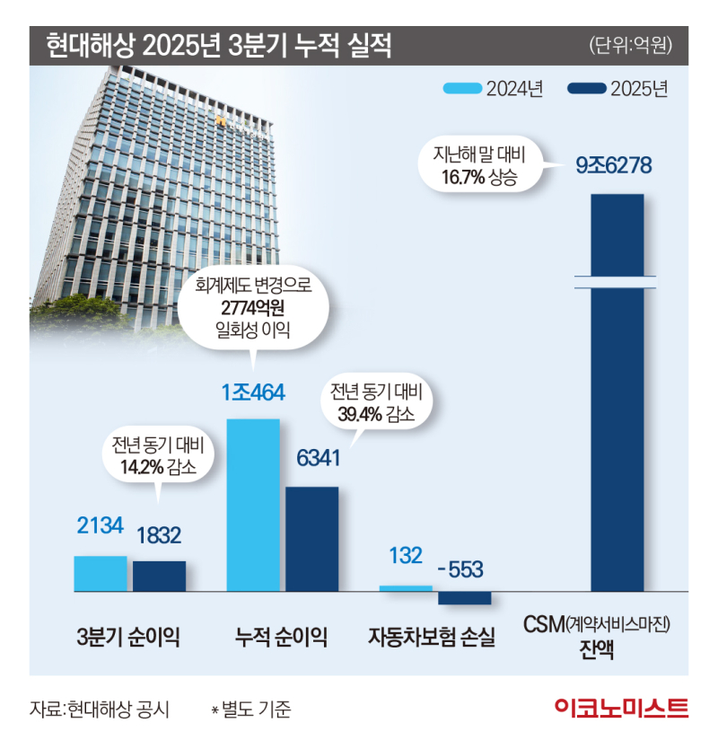 올 3분기까지 현대해상의 실적은 다소 부진하다. 현대해상의 올 3분기 별도 기준 당기순이익은 1832억원으로 전년 동기 대비 14.2% 감소했다. 같은 기간 누적 순이익(6341억원)은 39.4% 줄었다. 지난해 회계제도 변경으로 생긴 2744억원의 일회성 이익 반영분을 제외하면 감소 폭은 24.9%다.