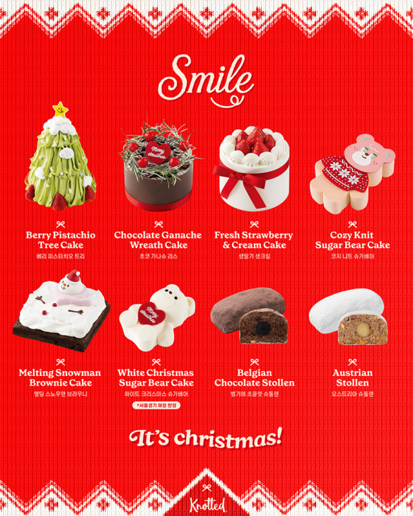 대표 제품인 ‘베리 피스타치오 트리’는 트리를 형상화한 비주얼에 고소한 피스타치오 시트·생딸기·부드러운 화이트 크림을 층층이 더해 계절감을 풍부하게 표현했다. ‘멜팅 스노우맨 브라우니’는 진한 초콜릿 브라우니 위에 눈사람 모양의 데코를 올려 녹아내리는 듯한 연출로 유쾌한 감성을 더했다. ‘코지 니트 슈가베어’는 니트를 입은 슈가베어 캐릭터를 중심으로 크림치즈 무스와 라즈베리 소스를 조합해 상큼하면서도 부드러운 맛을 살렸다.