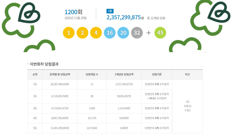 1200회 로또 1등 ‘1, 2, 4, 16, 20, 32’···보너스 번호 ‘45’