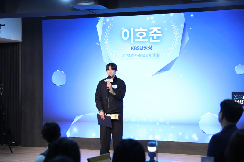 한국국제학교 10학년에 재학중인 이호준 청소년 기자는 제주도에서 성행하고 있는 남방큰돌고래 관광선박의 문제점을 제기한 르포 기사, <제주도 핫플로 떠오른 '돌고래 투어'...아슬아슬한 공존의 현장>으로 KBS사장상을 수상했다. 이호준 청소년 기자는 수상소감을 통해 “현재 제주도에 서식하고 있는 남방큰돌고래들은 약 120여 마리로 멸종위기에 처해있다”며 “돌고래를 보호하기 위한 생태법인 입법화가 절실한 상황”이라고 설명했다. 아울러 “이번 기사를 통해 더 많은 시민들이 제주 해양 생태계의 위기와 심각성에 대해 인지하고, 미래 세계에게 어떤 바다를 물려줄 지 생각하게 되는 계기가 됐으면 한다”고 밝혔다.