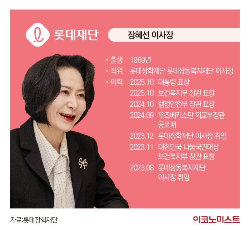 누적 지원금액 약 2478억원, 누적 수혜인원 약 38만5048명. 할아버지에서 어머니로, 다시 손녀로 이어지며 세대를 잇는 나눔을 실천한다. 롯데그룹 창업주 고 신격호 명예회장이 사재를 출연해 설립한 롯데재단을 이끄는 손녀 장혜선 롯데장학재단·롯데삼동복지재단 이사장은 2023년 취임 이래 ‘실질적이고 효율적인 지원’을 핵심 철학으로 진두지휘하고 있다. 여느 재벌가 구성원의 취임과 달리 장 이사장은 외부로 드러내기 쉽지 않은 개인의 아픔을 기꺼이 꺼내어 공감의 깊이를 더하고 있다. 장 이사장에게 지난 2년여간 가슴 뭉클했던 순간, 장학사업의 발전 방향, 재단이 꿈꾸는 미래까지 다양한 이야기를 직접 들어봤다.