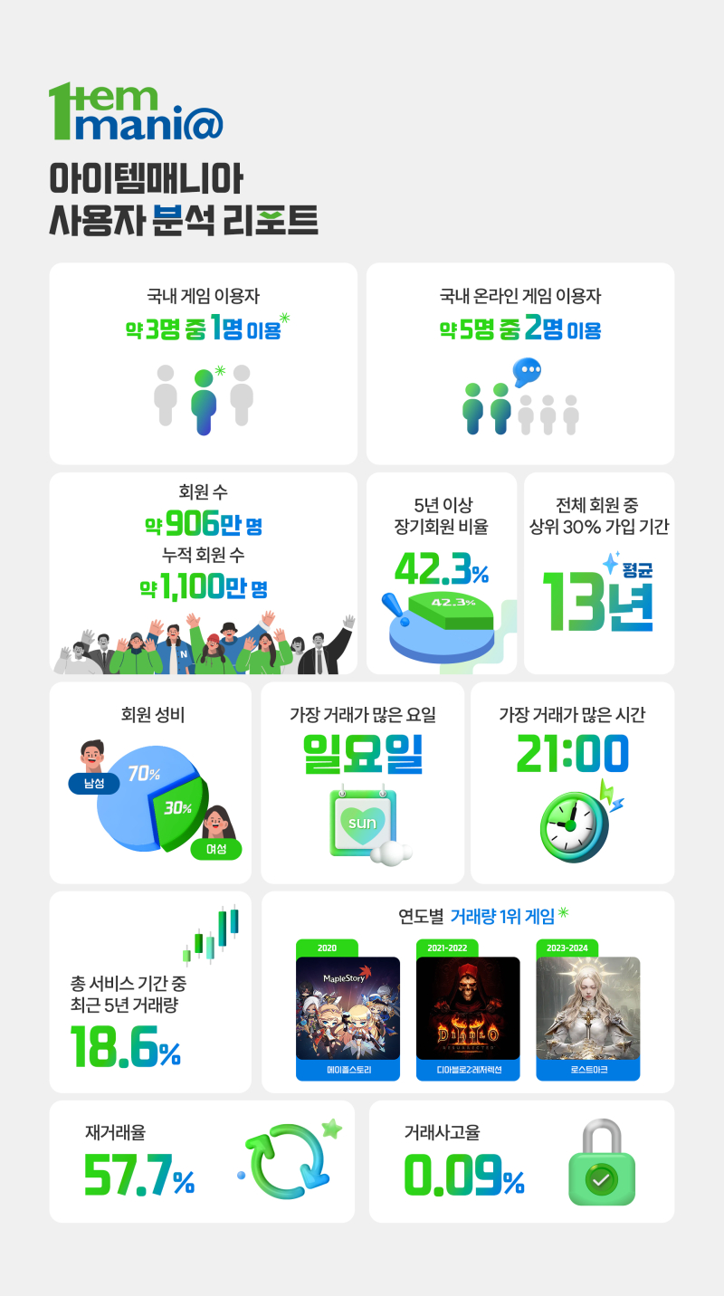 회원 성비는 남성 70%, 여성 30%로 구성됐으며, 지난 5년간 거래가 가장 활발했던 요일은 일요일, 시간대는 저녁 9시로 집계됐다. 가장 많이 거래된 게임은 ▲2020년 ‘메이플스토리’ ▲2021년~2022년 ‘디아블로2:레저렉션’ ▲2023년~2024년 ‘로스트아크’ 순이었다.