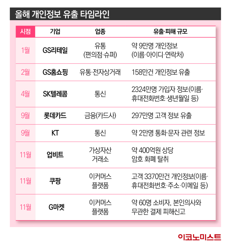 같은 달 27일에는 쿠팡마저 당했다. 쿠팡은 고객 3370만건 유출을 인정했다. 이름·휴대전화번호·주소·이메일 등 기본 인적 정보가 대량으로 빠져나갔다. 무엇보다 논란이 된 건 ‘인지 시차’였다. 공격 발생 후 약 5개월이 지나서야 이상 징후를 발견했다는 사실이 알려지기도 했다.