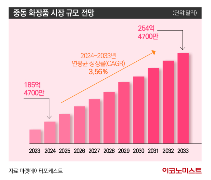기업들이 중동 시장을 전략적으로 공략하려는 가장 큰 이유는 현지 시장의 성장 가능성이다. 글로벌 시장조사기관 마켓데이터포케스트에 따르면 중동 뷰티 시장은 2033년 254억4700만달러(약 37조3700억원) 규모로의 성장이 예상된다. 2024년부터 2033년까지 중동 뷰티 시장의 연평균 성장률은 3.56%로 추산된다.