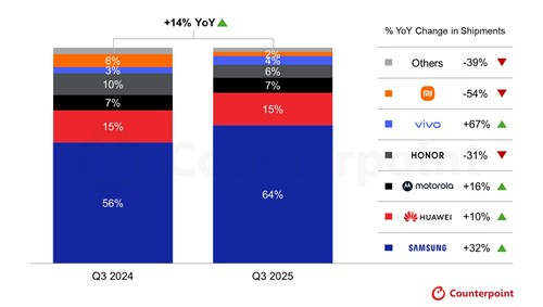 보고서는 “3분기 글로벌 폴더블 스마트폰 출하량은 전년 동기 대비 14% 증가하며 역대 최대 분기 실적을 기록했으며 삼성 갤럭시 Z 폴드7 시리즈가 가장 큰 성장 동력이 됐다”고 분석했다.