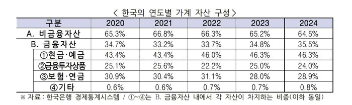 보고서는 이 같은 해외 사례를 바탕으로 비금융자산에 대한 쏠림현상을 완화하고 금융투자를 활성화하기 위한 방안으로 △금융소득 과세체계 개편 △장기투자 유도 △금융교육 강화를 제안했다.