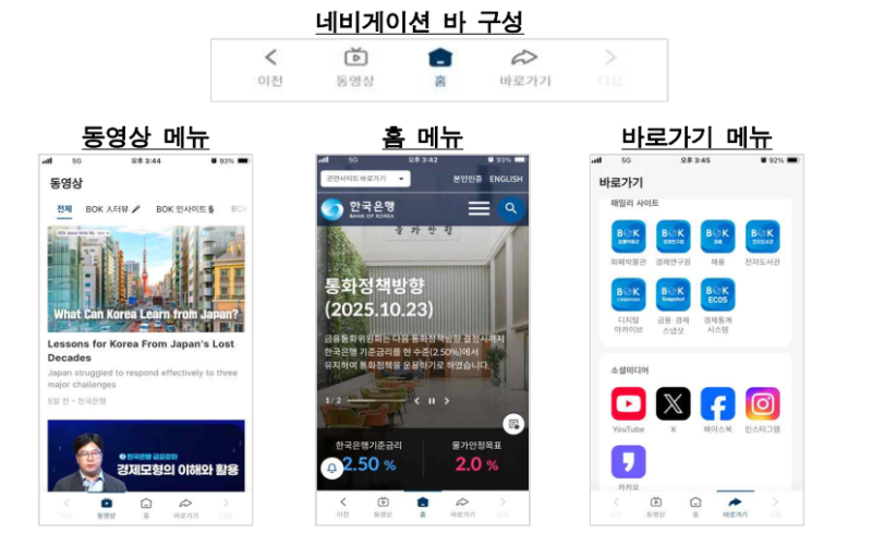 우선 한국은행 모바일 앱 하단 네비게이션 바를 통해 한국은행 모바일 홈페이지 이용, 유튜브 시청이 가능하다. 또한 바로가기를 통해 경제통계시스템, 금융·경제 스냅샷, 디지털아카이브, 화폐박물관 등 한국은행 사이트 및 한국은행 공식 소셜미디어채널에 바로 접근 가능하다.