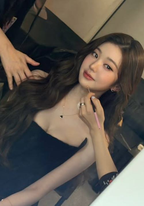 공개된 사진 속 장원영은 검은색 튜브톱 드레스를 착용하고 짙은 웨이브 헤어스타일로 고혹적인 매력을 발산했다. 특히, 메이크업을 수정하거나 촬영을 준비하는 듯한 모습이 담겨 시선을 사로잡는다.