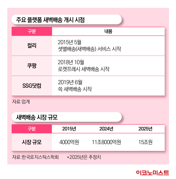새벽배송 시장은 복수 사업자가 뛰어들면서 본격적인 성장 가도에 올랐다. 한국로지스틱스학회에 따르면 새벽시장 규모는 2015년 4000억원에서 2024년 11조8000억원으로 약 30배 성장했다. 학회는 2025년 전체 새벽배송 시장 규모가 15조원에 달할 것으로 추정한다.