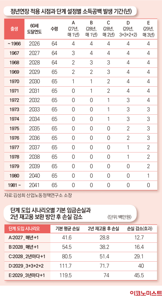 노후소득 크레바스(직장에서 은퇴해 국민연금 등 공적소득이 시작되기 전까지 발생하는 소득공백 기간)로 인한 연간 소득감소액(정규직 평균 월임금 389만6000원 기준)은 D, E 안에서는 1억원을 넘어 소득공백 총량이 매우 크다. 2년 재고용 방안을 혼합하면 연금과 정년의 불일치로 인한 소득 크레바스의 보완정책으로 효과적이긴 하나 역시 D, E 방안으로는 역부족이다. 물론 희망자 모두가 다 채용되는 재고용 의무화 방안은 민주당 안에서 제시되지 않았다. 의무화가 아닌 재고용으로 인한 임금손실 감소 효과는 절반 이하로 봐야 한다. 원판이 안 좋으면 헐거운 보완책으로는 어림도 없다.
