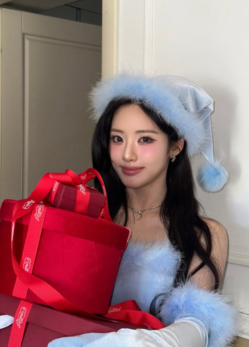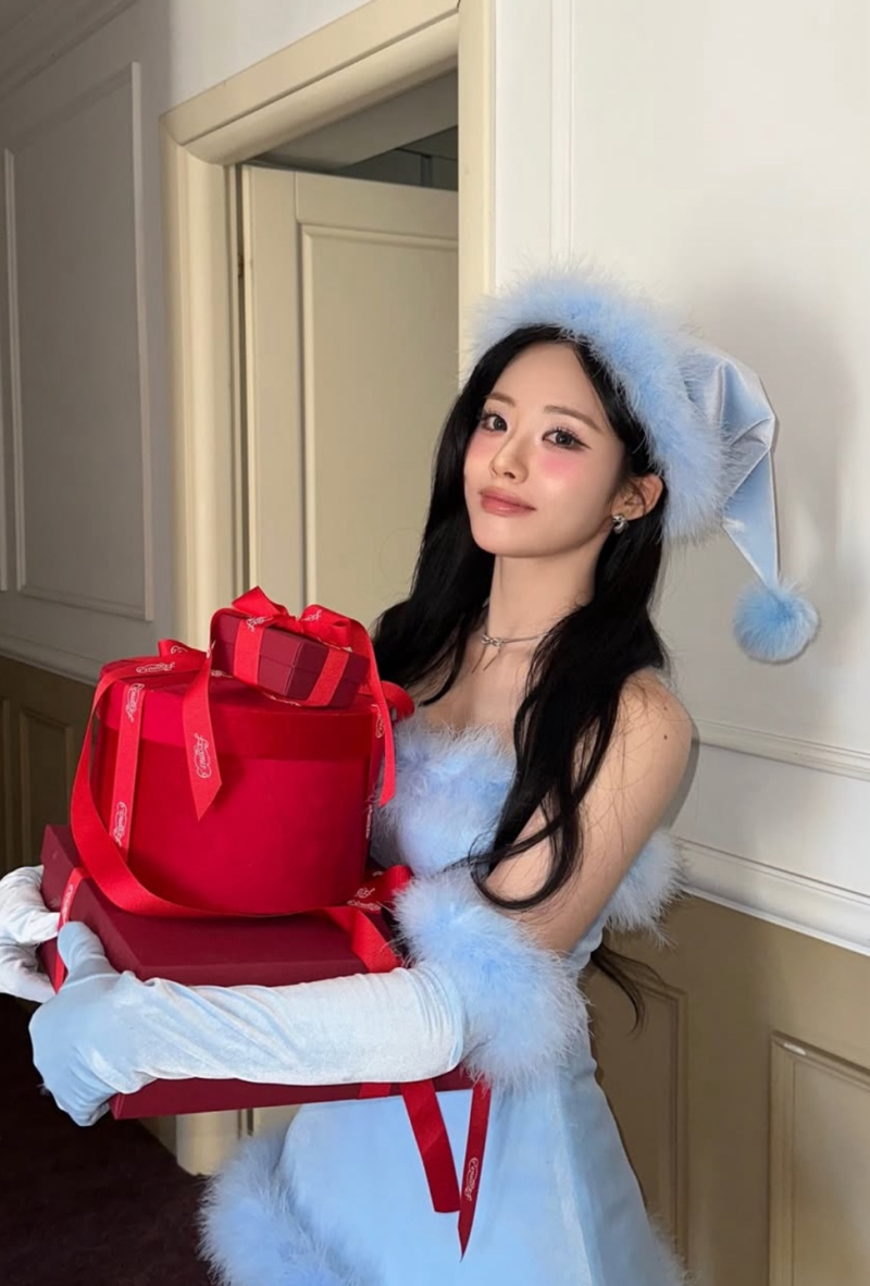 과하지 않은 블러셔와 또렷한 눈매 메이크업은 인형 같은 이목구비를 더욱 부각시키며, 흑발 웨이브 헤어와 대비돼 청순함과 몽환적인 무드를 동시에 살렸다. 특히 붉은 리본으로 장식된 선물 박스를 품에 안은 포즈는 연말 시즌 특유의 설렘을 극대화하며, 차분한 표정 속에서도 깊은 감성을 전한다.