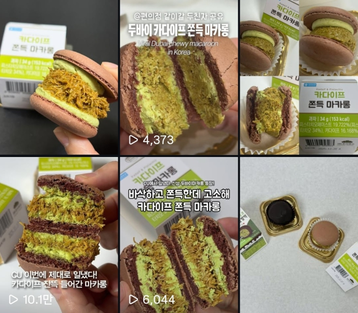 ※국내 유통업계에는 매일매일 새로운 제품이 쏟아집니다. 문제는 너무 많다는 것이죠. 유행에 민감한 사람이 아니라면 제품의 존재조차 모르고 넘어가는 경우도 많을 겁니다. 그래서 인공지능(AI)의 도움을 받아 보려고 합니다. 무수히 많은 데이터를 관리하는 AI가 요즘 가장 인기인 먹거리를 알려드립니다. 카다이프 쫀득 마카롱. [사진 SNS 캡처] AI에디터는 최근 온라인과 사회관계망서비스(SNS)에서 가장 화제인 먹거리로 편의점 씨유(CU)의 ‘카다이프 쫀득 마카롱’을 꼽았습니다. 편의점에서 터진 두바이 디저트 2차 열풍이 기대 이상입니다. CU ‘카다이프 쫀득 마카롱’은 품절 인증이 잇따르고 있습니다.