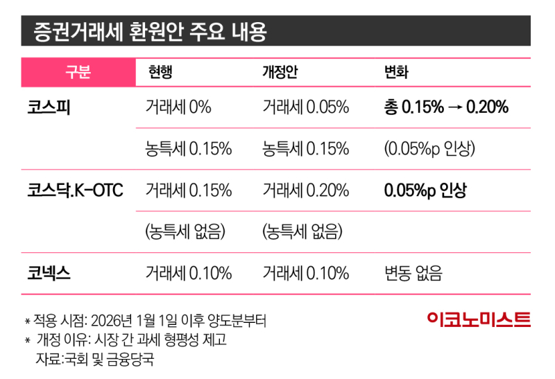 국회와 금융당국에 따르면 2026년 1월 1일 이후 코스피 시장의 증권거래세율은 현행 0%에서 0.05%로 조정된다. 농어촌특별세(0.15%)는 그대로 유지된다. 이에 따라 코스피 투자자는 앞으로 주식을 매도할 때 총 0.20%의 세금을 부담하게 된다. 코스닥·K-OTC 시장(농특세 없음)은 현행 0.15%에서 0.20%로 거래세율이 일제히 상향된다. 코넥스 시장의 거래세율은 0.10%로 변동이 없다. 정부는 시장 간 과세 형평성 제고를 개정 이유로 들고 있다.