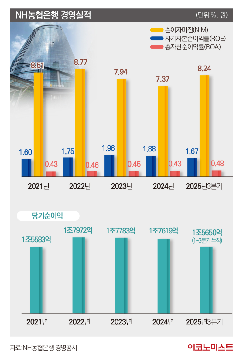 강태영 행장 취임 후 1년, 농협은행의 성적표는 ‘질적 성장’에 방점이 찍혀 있다. 2025년 3분기 누적 실적 보고서에 따르면 농협금융지주는 누적 당기순이익 2조2599억원을 기록했다. 이 중 농협은행의 누적 순익은 1조5796억원(별도기준 1조5650억원)을 거두며 그룹 전체 실적의 중추 역할을 했다.