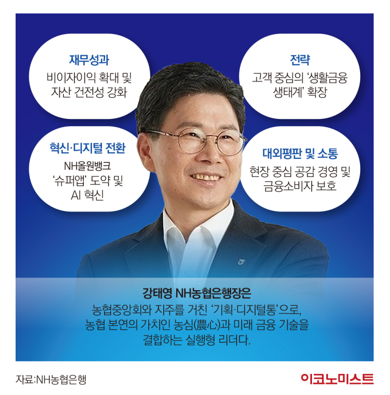 [이코노미스트 이병희 기자] “데이터는 오랜 시간 헌신과 축적을 통해 만들어지는 결과물로, 돈으로 살 수 없는 자산입니다. 데이터 중심의 기본 원칙에 충실한 은행으로서 다가올 AI 시대를 철저히 준비해 나가겠습니다.” 2025년 12월 18일, 과학기술정보통신부가 주최한 ‘2025 데이터 진흥 주간’에서 대통령 표창을 받은 강태영 NH농협은행장의 수상 소감은 그가 추구하는 경영의 지향점을 명확히 보여준다. 그는 취임과 동시에 농협은행의 고질적인 과제였던 ‘보수적 이미지’를 탈피하고, 실무와 기술을 결합한 ‘디지털 리딩뱅크’로의 전환을 선언했다.
