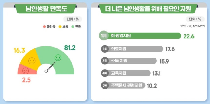 남한 생활 만족도 조사에선 '만족한다'는 응답은 81.2%로 전년 대비 1.6%포인트 상승했다. 만족한다는 응답 비율이 가장 높은 연령대는 '15~19세'(92.9%)였다. 만족하는 이유로는 '자유로운 삶을 살 수 있어서'(41.5%)가 가장 높았으며, 불만족한 이유로는 '(북한·제3국에 있는) 가족과 떨어져 살아야 해서'(24.3%)라고 응답한 비율이 제일 높았다.