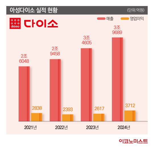 다이소의 가격 정책과 안전한 제품 관리는 지속 성장의 원동력이 된다. 회사의 최근 5년(2020년~2024년)간 매출은 ▲2020년 2조4215억원 ▲2021년 2조6048억원 ▲2022년 2조9458억원 ▲2023년 3조4605억원 ▲2024년 3조9689억원으로 꾸준히 우상향했다. 2025년은 연매출 4조원 돌파가 유력시된다.