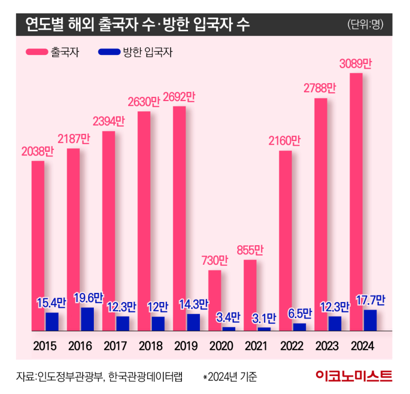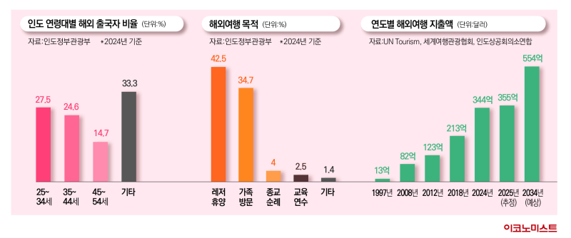 인도정부관광부에 따르면 인도 국적 해외 출국자는 지난해 사상 처음 3000만명을 돌파했다. 2015년 사상 첫 2000만명 돌파 이후 정확히 10년 만이다. 지난 2023년 전년 대비 30% 급증하며 코로나19 팬데믹 이전 최대였던 2019년 기록을 4%가량 웃돈 해외 출국자는 지난해에도 11% 늘어 3089만명을 기록했다.