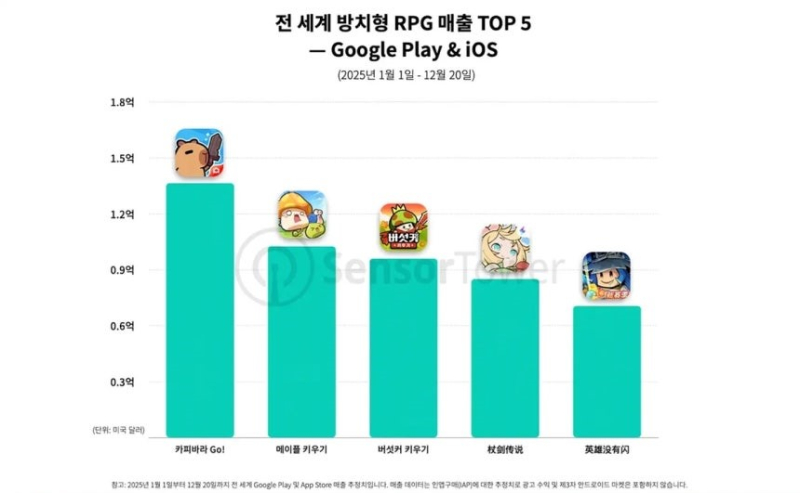 '메이플 키우기'는 이에 따라 출시 후 45일 매출만으로도 하비(Habby)의 '카피바라 Go!'에 이어 전 세계 방치형 RPG 매출 순위 2위에 올랐다. 센서타워는 "한국을 기반으로 미국과 같은 소비 여력이 높은 시장에서도 의미 있는 성과를 기록했다"라며 "개별 게임의 성공을 넘어, 한국 방치형 RPG 시장의 매출 규모와 존재감을 다시 한번 부각하는 계기로 작용했음을 보여준다"라고 평가했다.