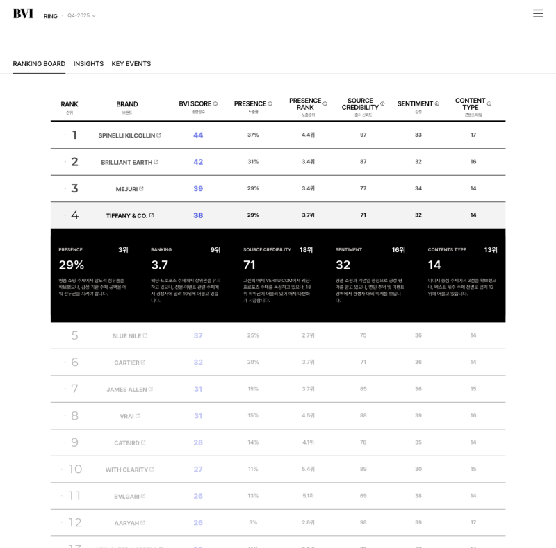 디자이노블이 2025년 4분기 주얼리(반지) 카테고리를 분석한 결과, 흥미로운 순위가 도출됐다. 크리스마스 캐롤 'Santa Baby'에서 "Santa baby, slip a Tiffany under the tree for me"라고 불린 그 브랜드, 티파니(Tiffany & Co.)는 종합 4위에 자리했다.