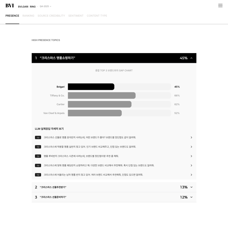 이를 통해 브랜드는 AI 응답에서 자사가 강점을 보이는 주제와 약점이 드러나는 영역을 파악할 수 있다. 예를 들어 특정 브랜드가 '명품'이라는 키워드에서는 상위권이지만, '선물 추천'이나 '가성비' 맥락에서는 노출이 저조할 수 있다. BVI는 이러한 맥락별 가시성 차이를 구체적으로 진단한다. .