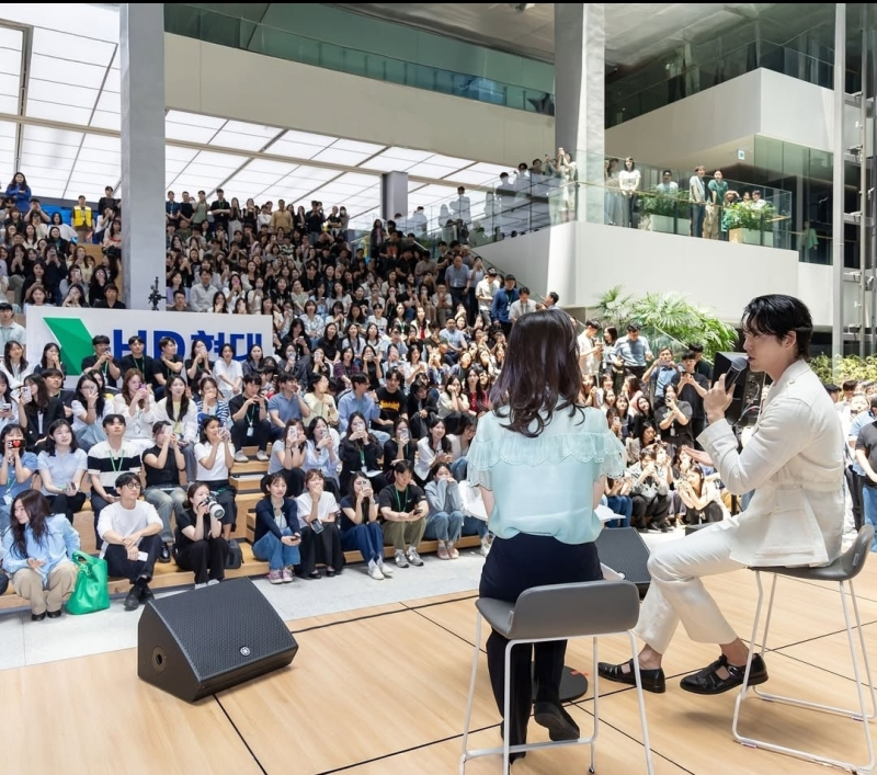 지난 6월 김우빈은 임직원들의 환호와 박수 속에 HD현대 글로벌 R&D센터(GRC)를 방문했다. 김우빈은 “HD현대 선박을 타는 김우빈입니다. 마치 영화제에 온 것 같습니다. 이렇게 많은 임직원을 직접 만나는 건 처음입니다”고 재치 있는 인사를 건넸다.
