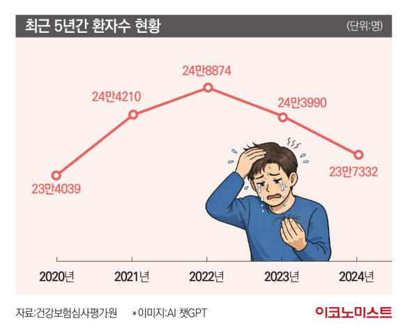 건강보험심사평가원 통계에 따르면 지난해 국내 탈모 진료 환자는 약 23만7000명 수준으로 최근 몇년간 약 24만명 수준을 유지하고 있다. 연령대별로 보면 2040세대가 가장 높은 비중을 차지하고 있다.
