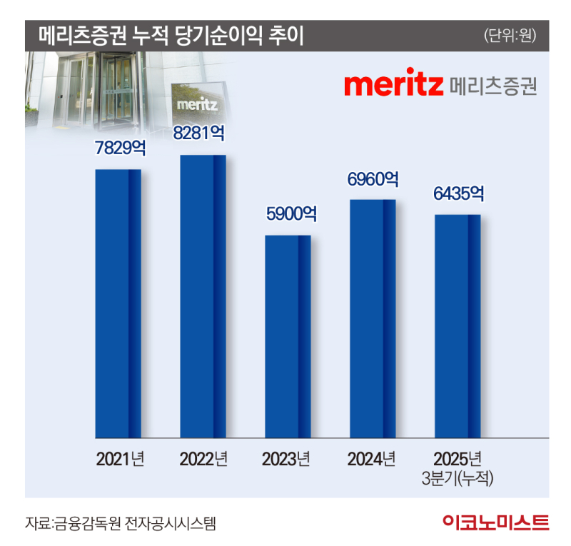 실적은 수치로 확인된다. 메리츠증권은 2025년 3분기 누적 기준 6435억원의 당기순이익을 기록했다. 이는 2024년 같은 기간보다 18% 증가한 수준이다. 연도별 누적 당기순이익 추이를 보면 실적 변화가 보다 분명해진다. 2021년 7829억원, 2022년 8281억원으로 고점을 형성한 뒤 2023년에는 5900억원으로 주춤했으나, 2024년 6960억원으로 반등했다. 올해는 3분기까지 이미 6400억원을 넘어서며, 연간 기준으로 다시 한 단계 도약할 수 있는 기반을 마련했다는 평가다.