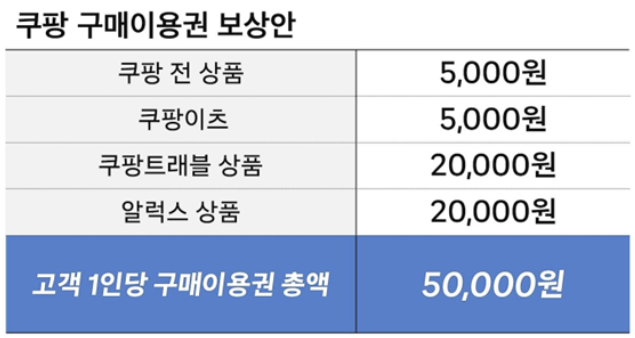 쿠팡이 밝힌 고객 보상안은 1회 사용이 가능한 구매 이용권 4가지로 ▲로켓배송·로켓직구·판매자 로켓·마켓플레이스 쿠팡 전 상품(5000원) ▲쿠팡이츠(5000원) ▲쿠팡트래블 상품(2만원) ▲알럭스 상품(2만원) 등이다. 구매 이용권은 탈퇴 회원에게도 지급된다.