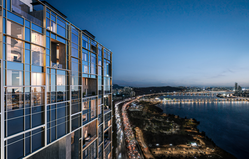 단지 설계 역시 ‘아스턴55’의 차별화 요소로 꼽힌다. ‘아스턴55’는 기획 단계부터 한강 조망의 완성도를 최우선 가치로 삼아 건축 설계를 진행했다. 한강을 정면으로 품은 건물 전면 길이는 약 120m에 이르며, 전 세대에는 약 30m에 달하는 와이드한 광폭 설계를 적용해 공간의 깊은 곳까지 한강 조망이 가능하도록 했다. 전세대가 파노라마 한강 뷰를 확보한 것이 특징이다.