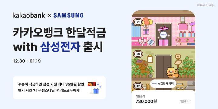 카카오뱅크는 한 달 저금하면 삼성전자 가전 구매 혜택과 경품을 받을 수 있는 '한달적금 with 삼성전자'를 출시한다고 30일 밝혔다.