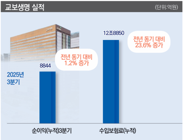 교보생명의 지난해 3분기 누적 연결기준 당기순이익은 8844억원으로 집계됐다. 이는 전년 동기 대비 1.2% 증가한 수치다. 같은 기간 수입보험료(매출)는 12조8850억원으로 전년 동기 대비 23.6% 급증했다.