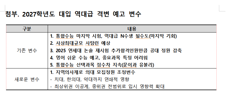 이처럼 변수가 이미 충분히 큰 상황에서, 2025학년도에 촉발된 ‘의대 모집 정원 확대’ 이슈가 2027학년도에 또 하나의 중대 변수로 떠오르고 있다. 입시 판의 최상단을 흔드는 요인은 결국 하위권까지 연쇄적으로 파장을 만들기 마련인데, 의대 정원 문제는 그 대표적 사례가 될 수 있다.