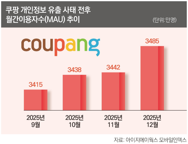 다만 이런 움직임이 쿠팡에 직접적인 영향을 주지는 않는 것으로 보인다. 개인정보 유출 사태 이후에도 쿠팡의 이용자 수가 증가세를 보여서다. 데이터 테크기업 아이지에이웍스 모바일인덱스에 따르면 쿠팡의 지난해 12월 MAU(추정치)는 3484만7887명로 집계됐다. 이는 전월(3442만207명) 대비 40만명 이상 늘어난 것이다. 쿠팡은 지난해 8월부터 12월까지 매월 MAU 오름세를 이어가고 있다.