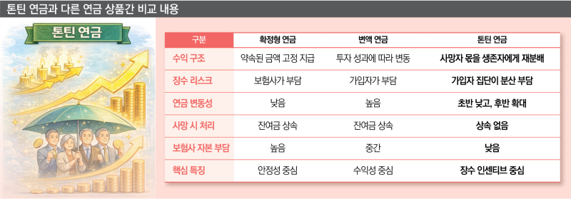 신한라이프가 이번에 출시한 톤틴보험도 이와 유사하다. 기존 톤틴연금은 연금 개시 전 사망 시 보험료를 돌려받지 못하는 구조 탓에 국내에서는 제도·소비자 보호 기준에 맞지 않아 도입이 불가능했다.