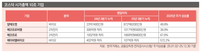 신규로 시총 10조를 기록한 에코프로, 에이비엘바이오의 수익도 크게 개선됐다. 에코프로의 지난해 3분기 누적 영업이익은 1669억8800만원을 기록하며, 지난해 같은 기간의 적자에서 흑자 전환을 이뤘다. 에코프로는 올해를 ‘글로벌 경영 2.0’ 원년으로 규정하고, 유럽 전초기지인 헝가리 공장과 인도네시아 제련소 등 해외 사업장 고도화에 역량을 집중한다는 방침이다. 에이비엘바이오는 지난해 3분기 누적 기준으로 107억원 영업손실을 기록했지만, 전년의 402억원 영업손실과 비교해 개선 속도가 빨라진 모습을 보였다.