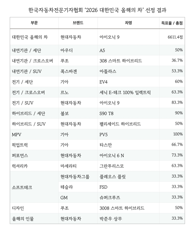부문별 수상은 ▲대한민국 올해의 차 ‘현대차 아이오닉 9’ ▲올해의 내연기관 세단 ‘아우디 A5’ ▲올해의 내연기관 크로스오버 ‘푸조 308 스마트 하이브리드’ ▲올해의 내연기관 SUV ‘폭스바겐 아틀라스’ ▲올해의 전기 세단 ‘기아 EV4’ ▲올해의 전기 크로스오버 ‘르노코리아 세닉 E-테크 100% 일렉트릭’ ▲올해의 전기 SUV ‘현대차 아이오닉 9’ ▲올해의 하이브리드 세단 ‘볼보 S90 T8’ ▲올해의 MPV ‘기아 PV5’ ▲올해의 픽업트럭 ‘기아 타스만’ ▲올해의 퍼포먼스 ‘현대차 아이오닉 6 N’ ▲올해의 럭셔리카 ‘마세라티 그란투리스모’ ▲올해의 디자인 ‘푸조 3008 스마트 하이브리드’ 등이다. ▲올해의 인물에는 현대자동차그룹에서 N브랜드를 담당하는 박준우 상무가 선정됐다.