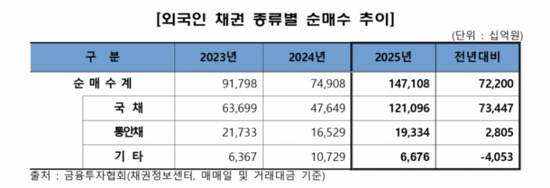 한국금융투자협회가 15일 발표한 ‘2025년 장외채권시장 동향’에 따르면 지난해 외국인의 국내 채권 순매수 규모는 총 147조 1000억 원으로 집계됐다. 이는 전년보다 72조 2000억 원 증가한 수치다. 국채 순매수가 121조 1000억 원으로 가장 많았고 통화안정증권도 19조 3000억 원어치 순매수했다.